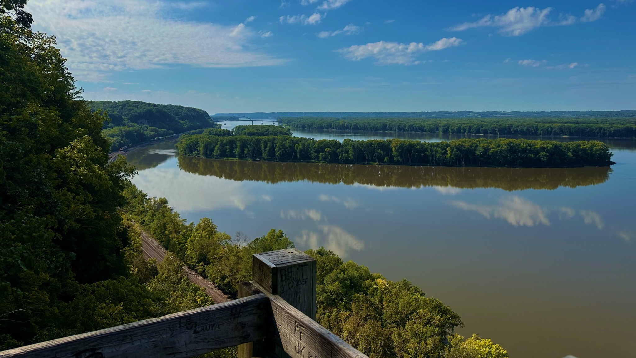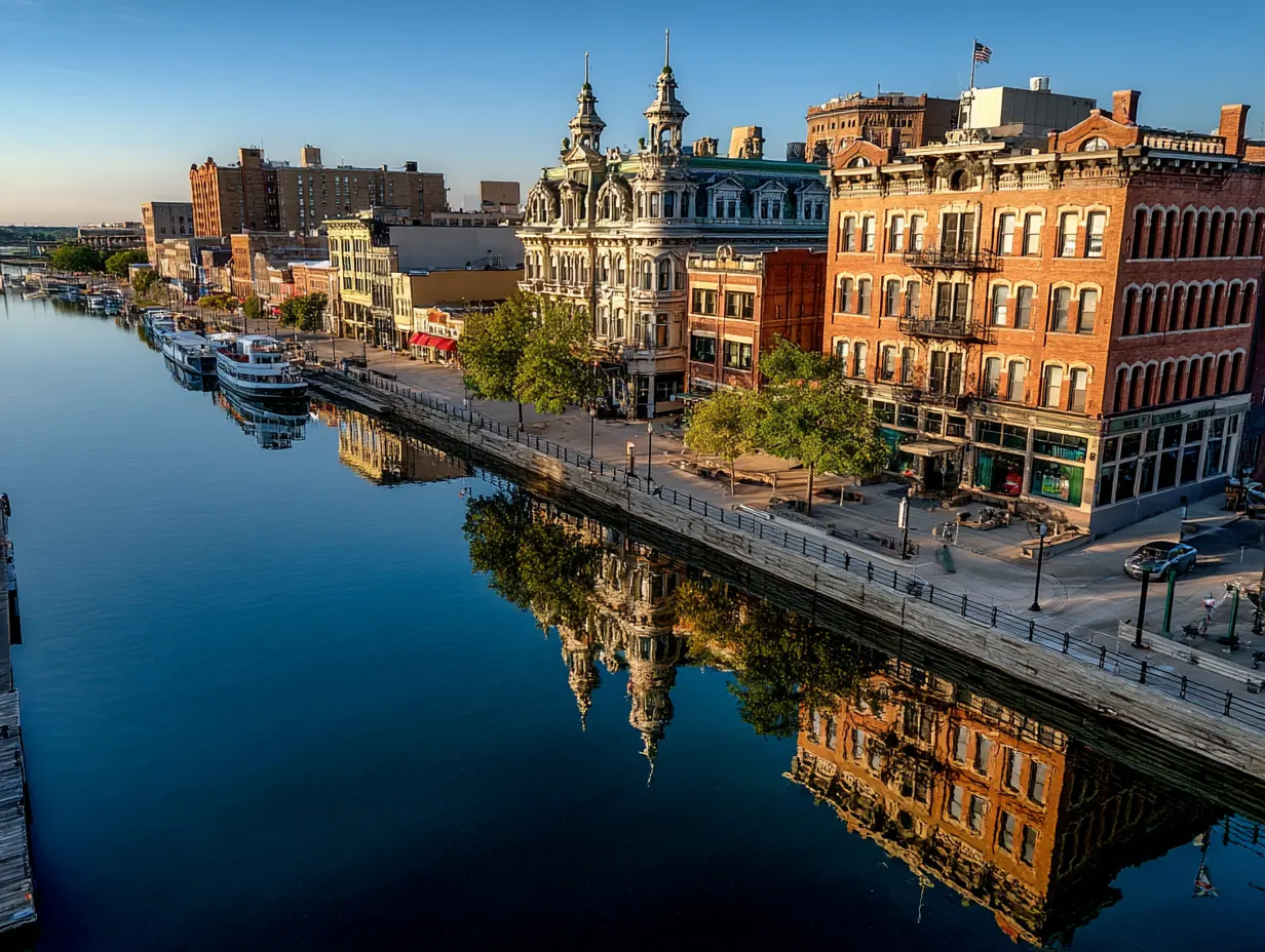 Żegnamy Nauvoo i ruszamy na północ wzdłuż Missisipi, w stronę Davenport, Iowa. Piękna trasa przez wzgórza zachodniego Illinois — za oknem mozaika pól, sadów i błyszczącej rzeki. Około 50 minut spokojnej jazdy. Dobry moment na drzemkę albo na pytania do przewodnika.